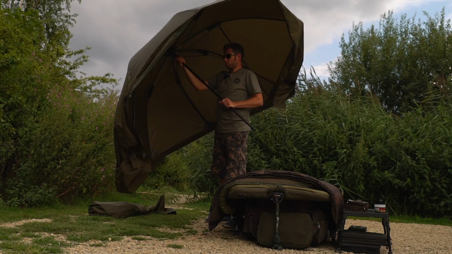 Mezi rybářskými deštníky je Full Cover 2 Man opravdový gigant. Rozměry se blíží spíše k bivakům, ale hmotnost je úplně někde jinde. Oproti bivakům a robustním brolly systémům mají rybářské deštníky jednu jasnou přednost – jsou lehké a postavené doslova za pár minut. Zvládne to bez problémů jeden člověk, aniž by se zapotil. U bivaku je to jiná, je těžký a jeho stavba zabere víc času i energie.