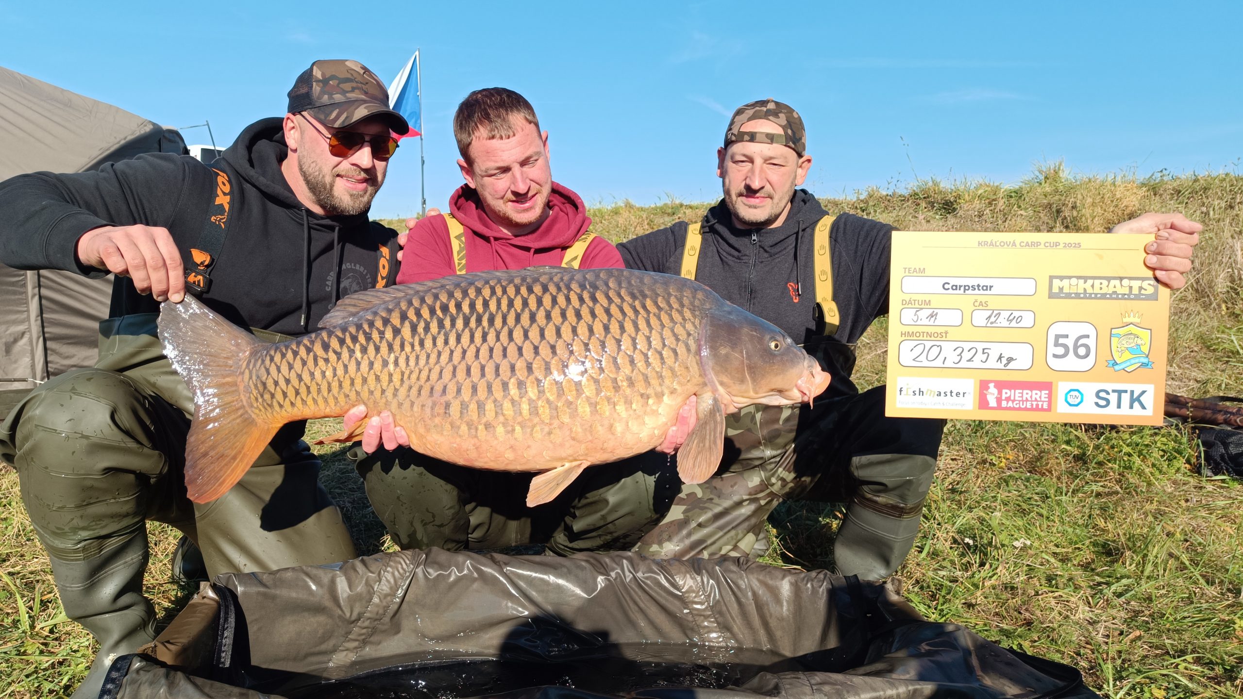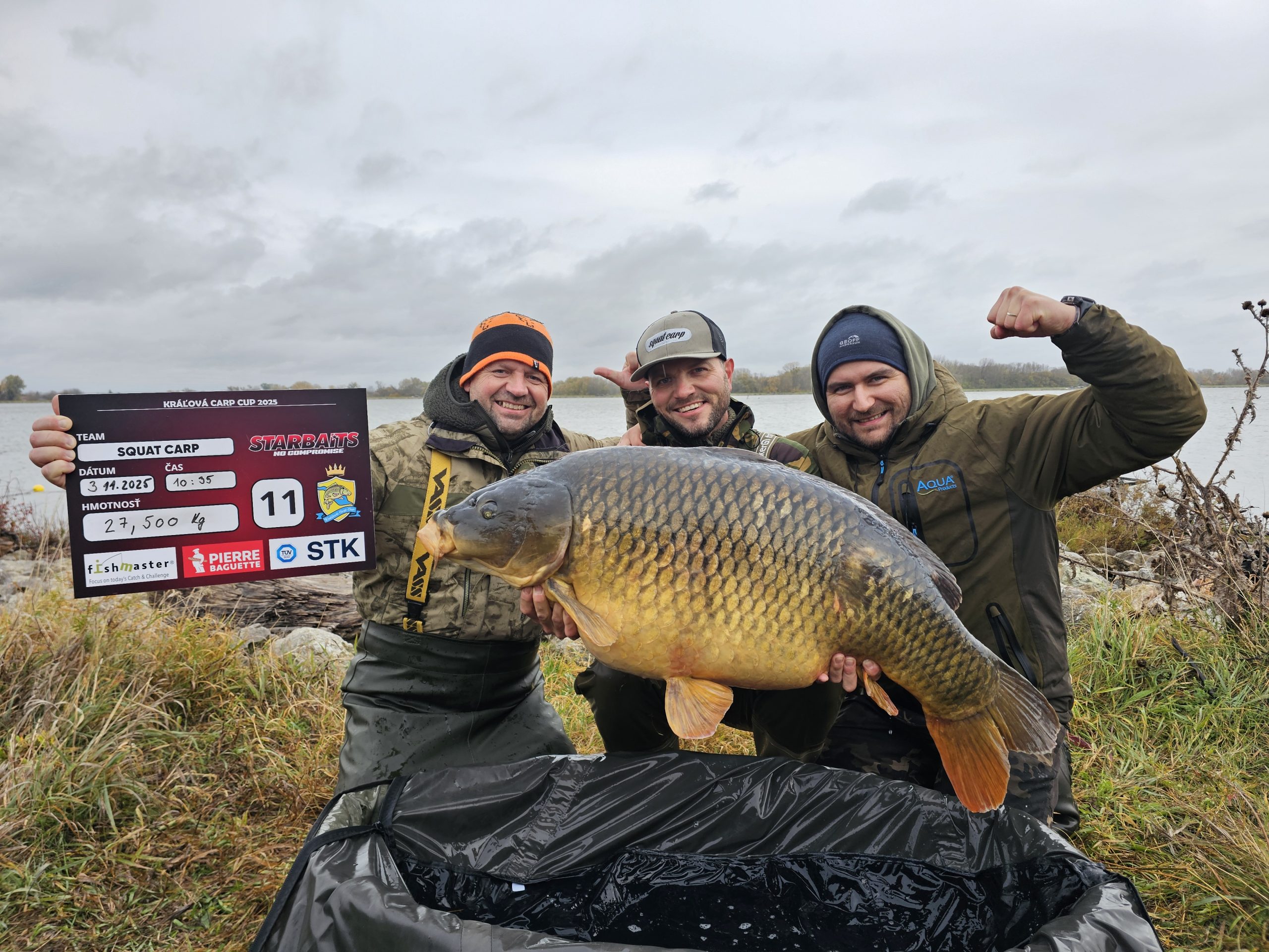 Zajímavý příběh napsali kapraři z týmu CT Squat Carp, kterým se podařilo v pondělí dopoledne zdolat nejtěžšího kapra závodů. Nádherný šupináč vážil přesně 27,5 kg a krásně doplňoval první ulovenou rybu, kterou byl šupináč 21,525 kg, jehož chytili krátce po zahájení závodů.