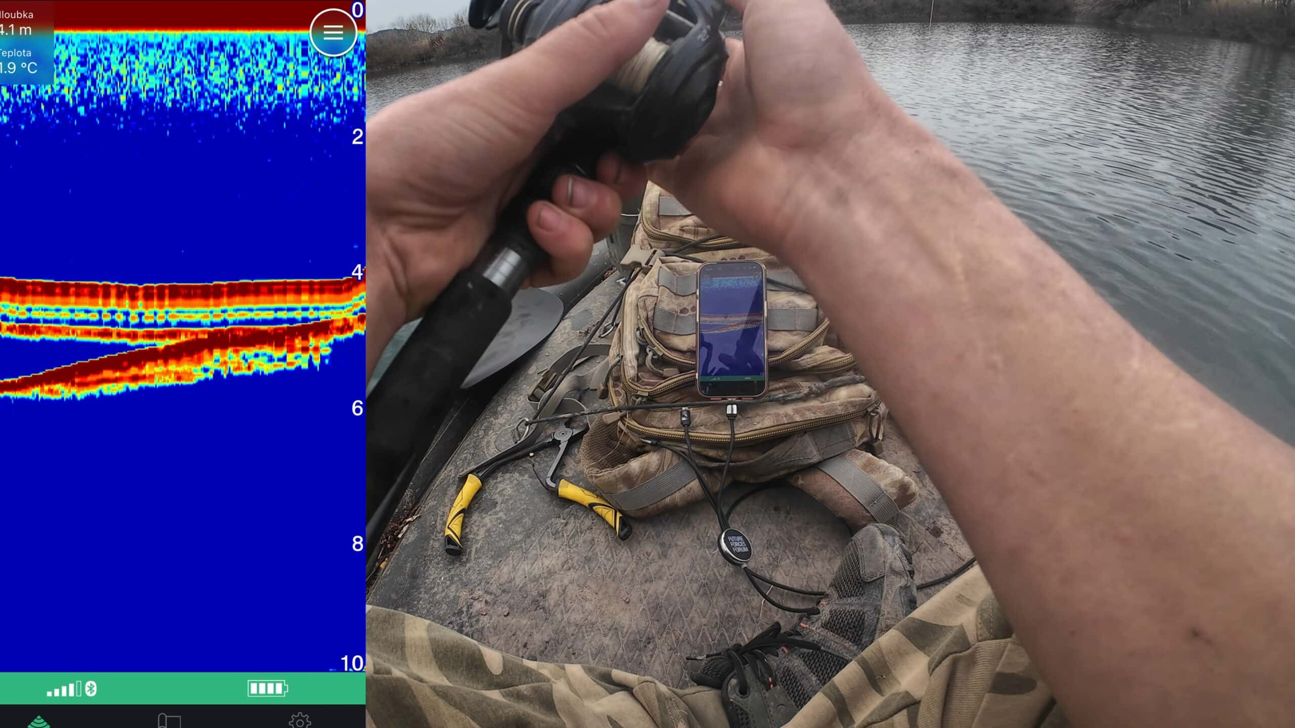 Jako nástrahu zvolil žížaly. „Jsou tam tři kousky, 150 chobotnička a šup s tím do vody,“ povídal a vzápětí zapnul i sonar. Zřetelně pak svým divákům vysvětloval, co znamená která čára, která z nich je ryba nebo jak se zachovat, když ryba vystoupá.