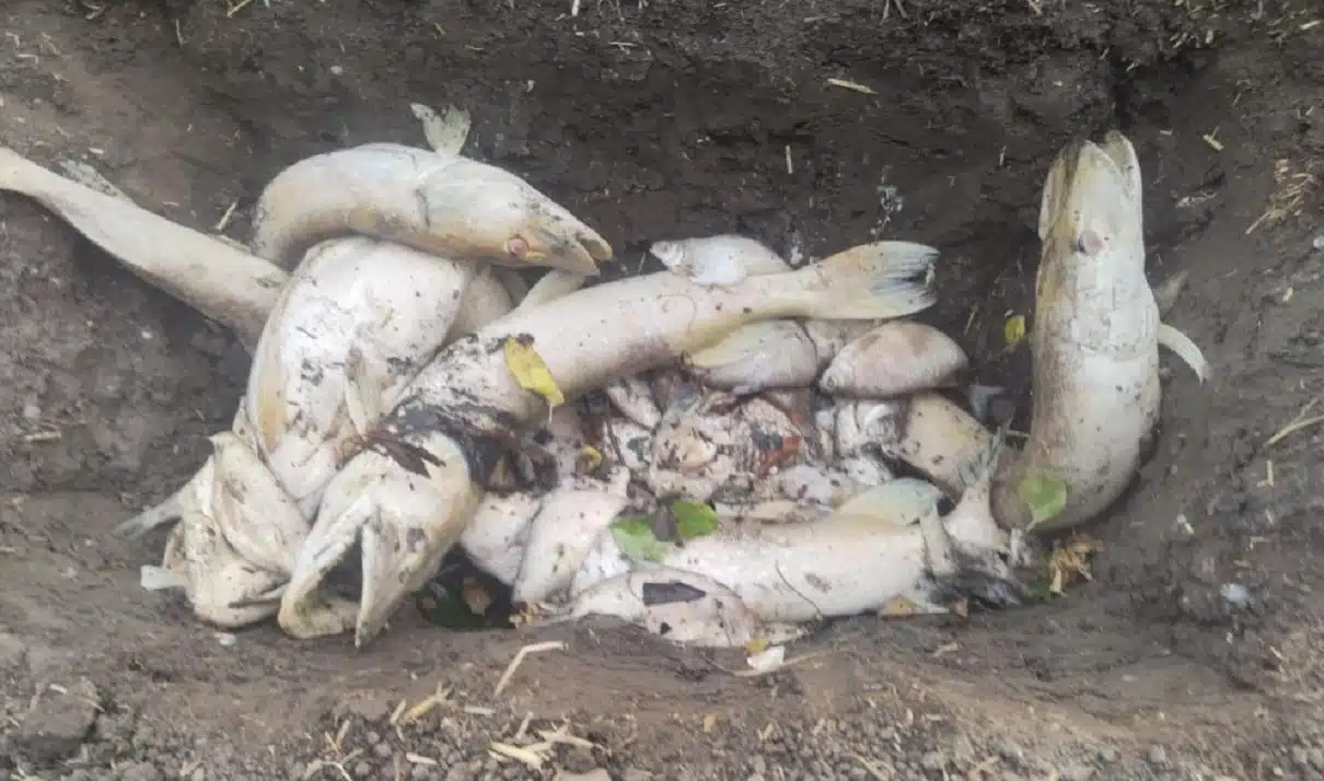 Video, které pořídil jeden z rybářů, ukazuje obří kapry stojící u břehu, některé již obrácené na bok, zatímco trofejní úhoři zoufale kroužili v mělké vodě.