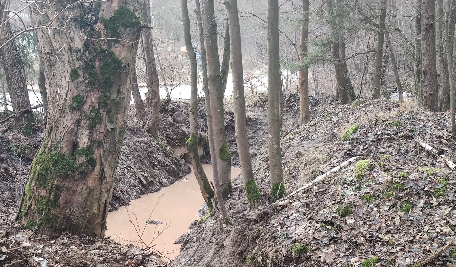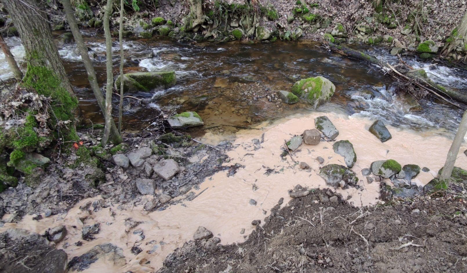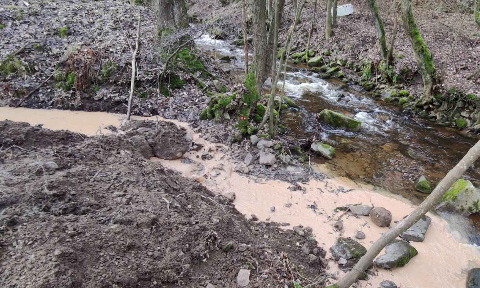 Tohle už není normální! Silvie Havlíková z rybářského kroužku Parmičky Sokolov na sociální sítě nahrála fotografie a video, na kterých je zveřejněná silně podkalená voda. Ta podle ní teče vybagrovanou strouhou z areálu lomu do chovného potoka.