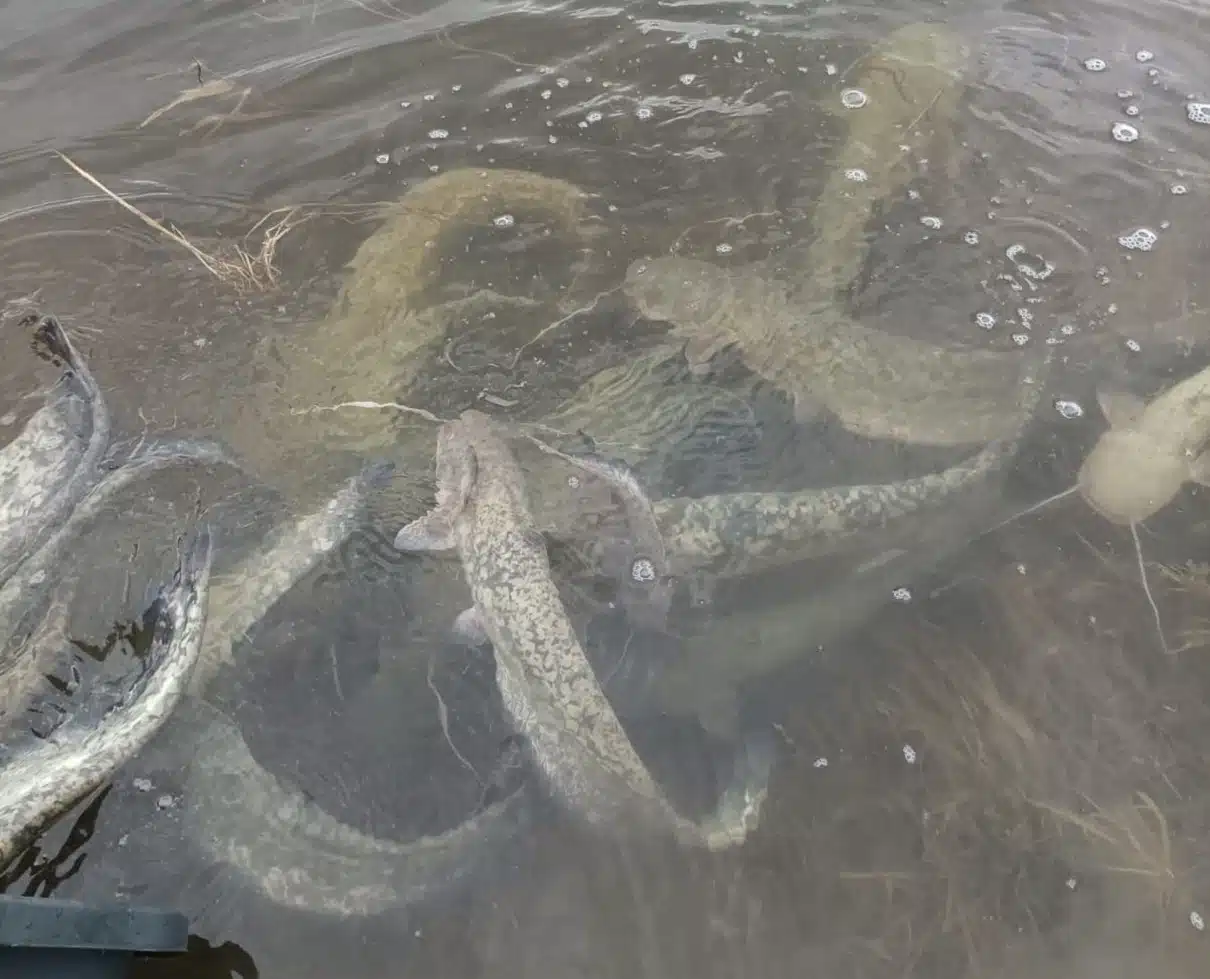 Když se první tělo konečně přibližuje k hladině, začíná být jasné, že nejde o malou rybu. Obrovské šedé tělo, dlouhé vousy… sumec jako z katalogu trofejních úlovků. Jenže v momentě, kdy rybář přitáhne úlovek blíž, přichází šok. Vedle prvního sumce se u hladiny objevuje druhé monstrum. Na jednom systémku dva obří sumci, každý chycený na jeden háček.