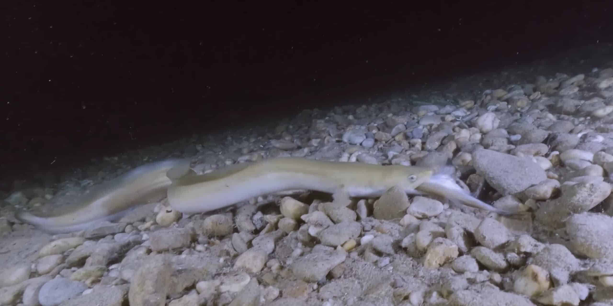 Další taktika zachycená na podvodní kameru sleduje úhoře, který se snaží schovávat za menším kamenem. Ale ani tentokrát se hadovité rybě nedaří.