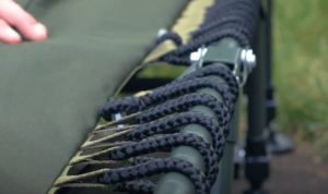 A nyní se dostáváme k opravdu důležitému prvku! Uchycení matrace ke konstrukci je u lehátka řešeno silnými provazy. V minulosti se používala guma, která se časem vytahala, a místo pohodlného lehátka jste spali ve „vaně“. Tento problém je minulostí. Provazové uchycení zajišťuje pevnost a stabilitu i po letech používání, což ocení zejména dobře živení rybáři – lehátko zůstává rovné a komfortní.