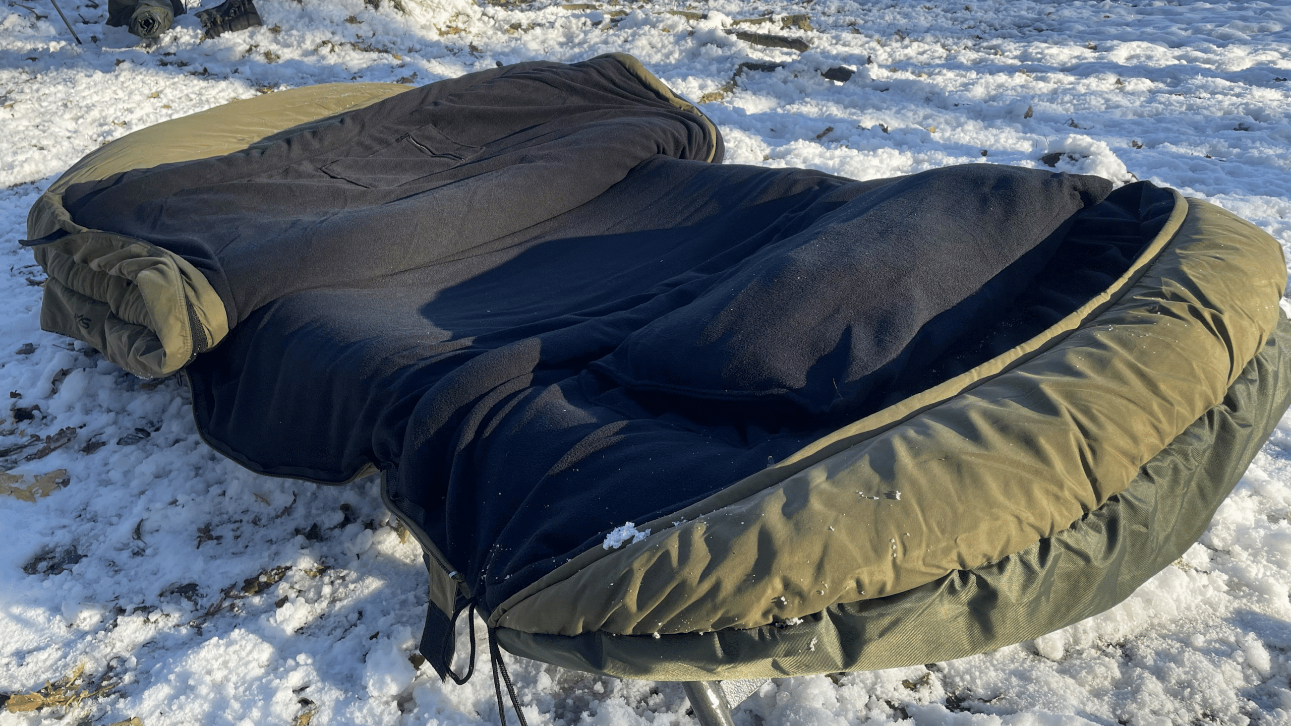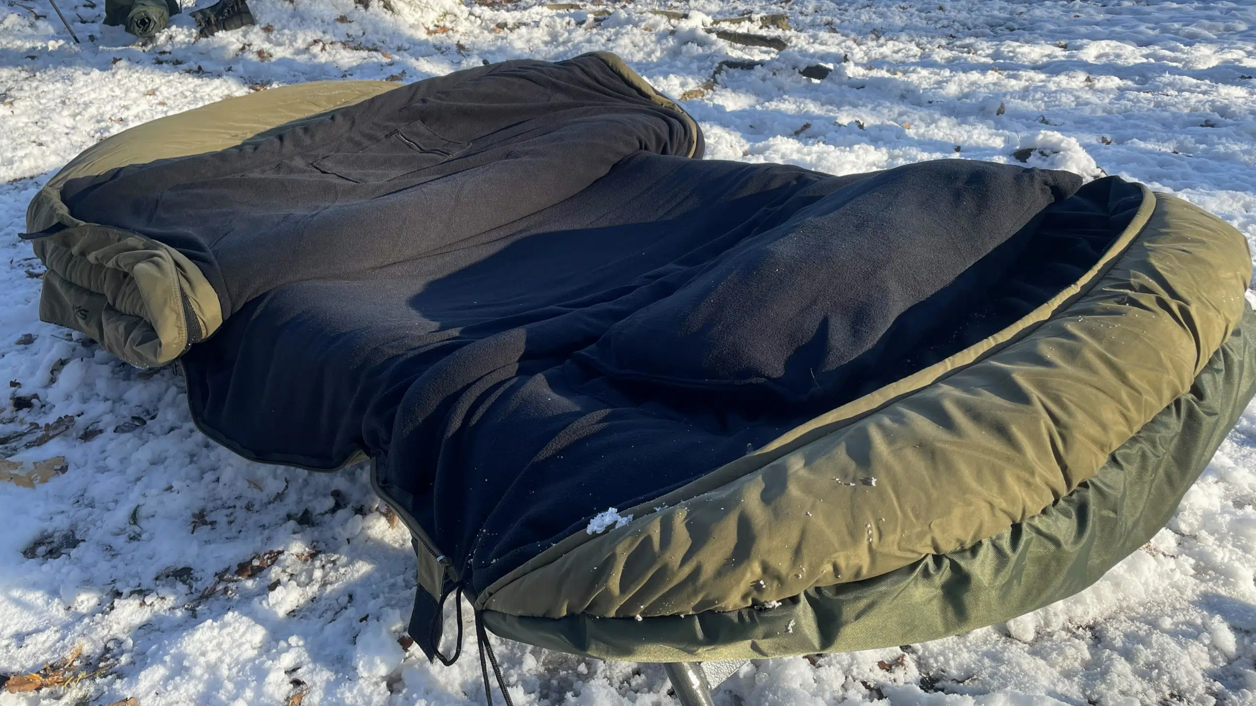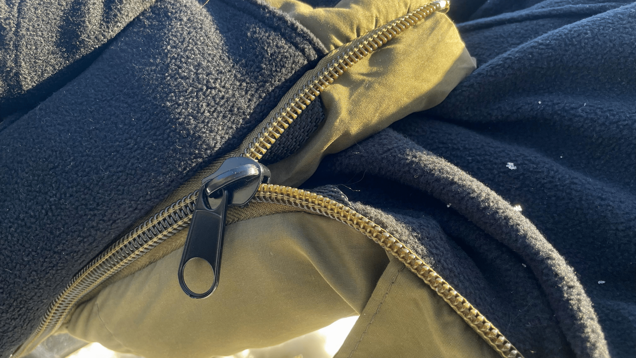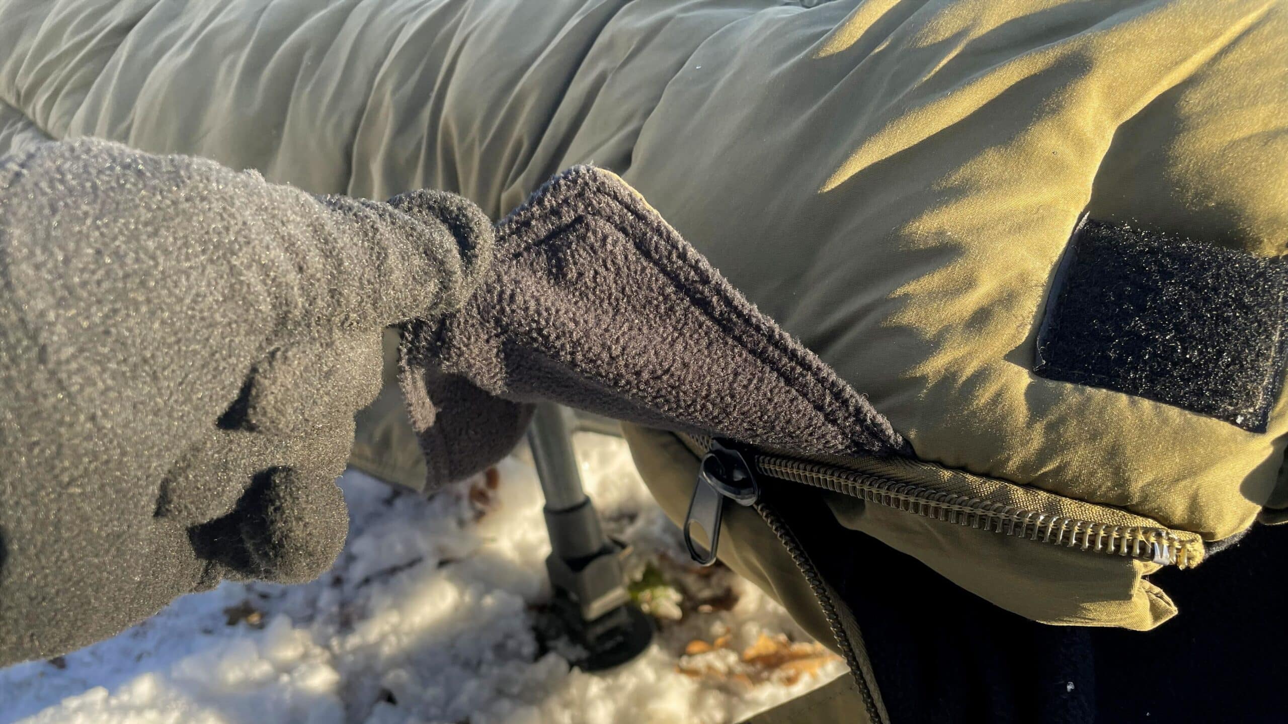 Po obou stranách spacáku jsou robustní zipy, takže nehrozí žádné zasekávání při otevírání nebo zavírání spacího pytle. Vývojáři z firmy Giants Fishing navíc nechali našít po celé délce zipu hrubý lem, takže se nemusíte bát, že by mikrofleece zalézal do zipu. Dále je celý zip po obou stranách překryt látkou s mikrofleecem, což omezuje úniky tepla v jeho oblasti – problém, který dobře známe u jiných modelů spacáků.