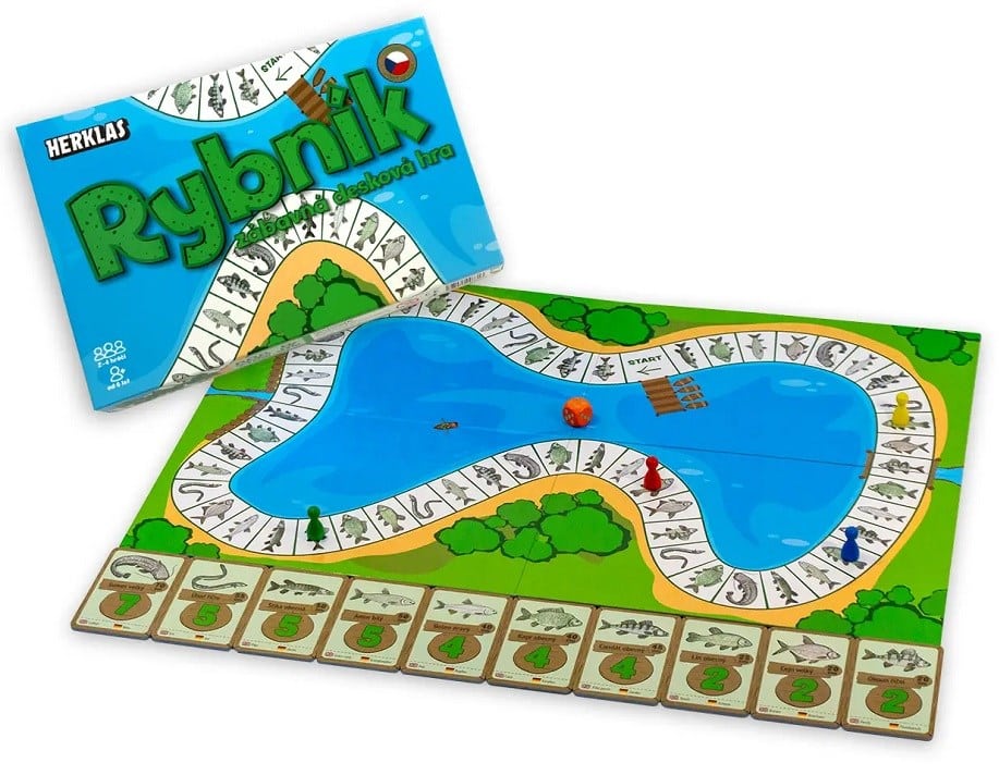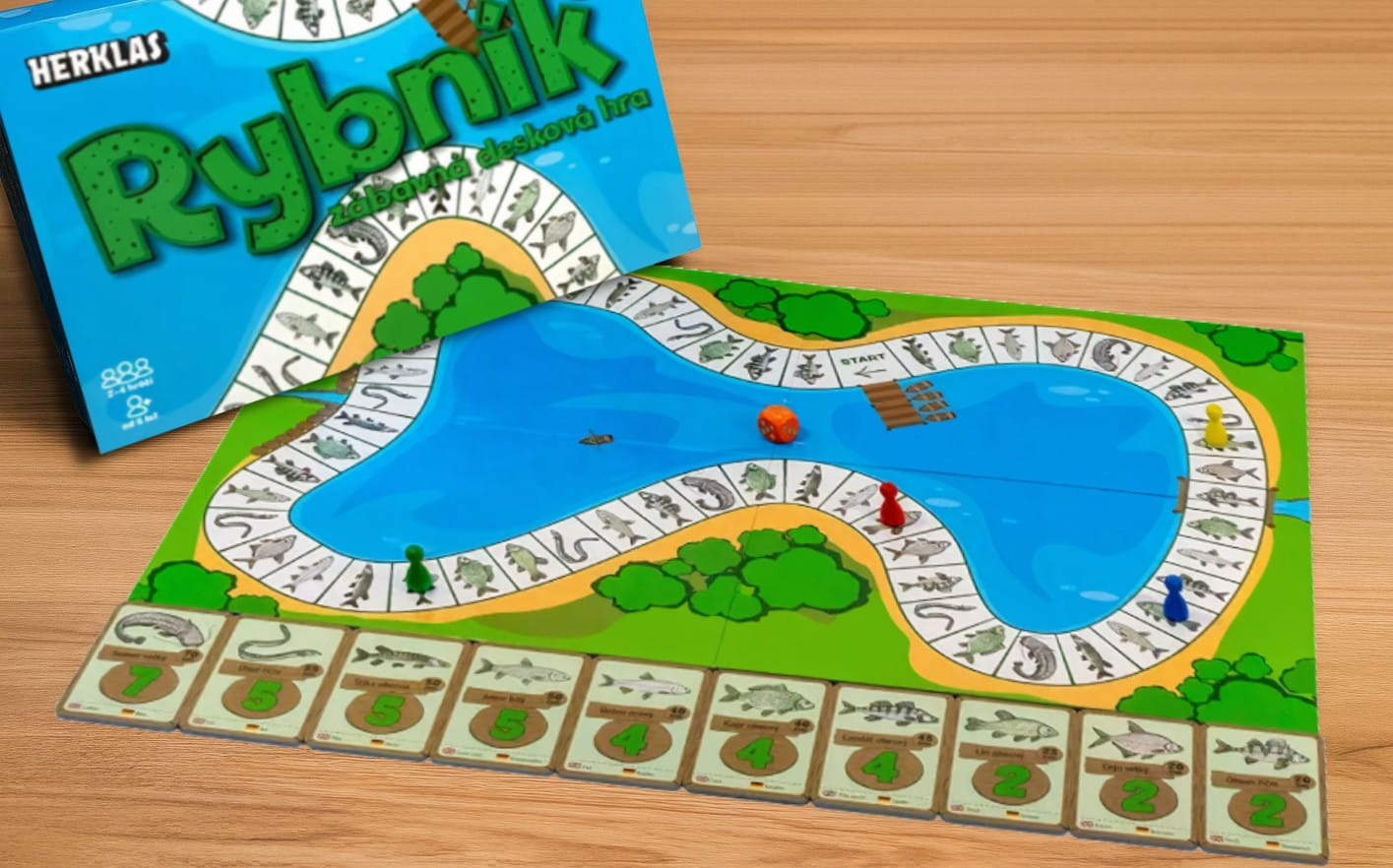 Hned další hra, která následuje — naučná desková hra Rybník od Herklasu — má kostku i figurky přímo v balení. A jedná se o plnohodnotnou rodinnou „rybářskou“ deskovku, která u stolu zabaví malé i velké.