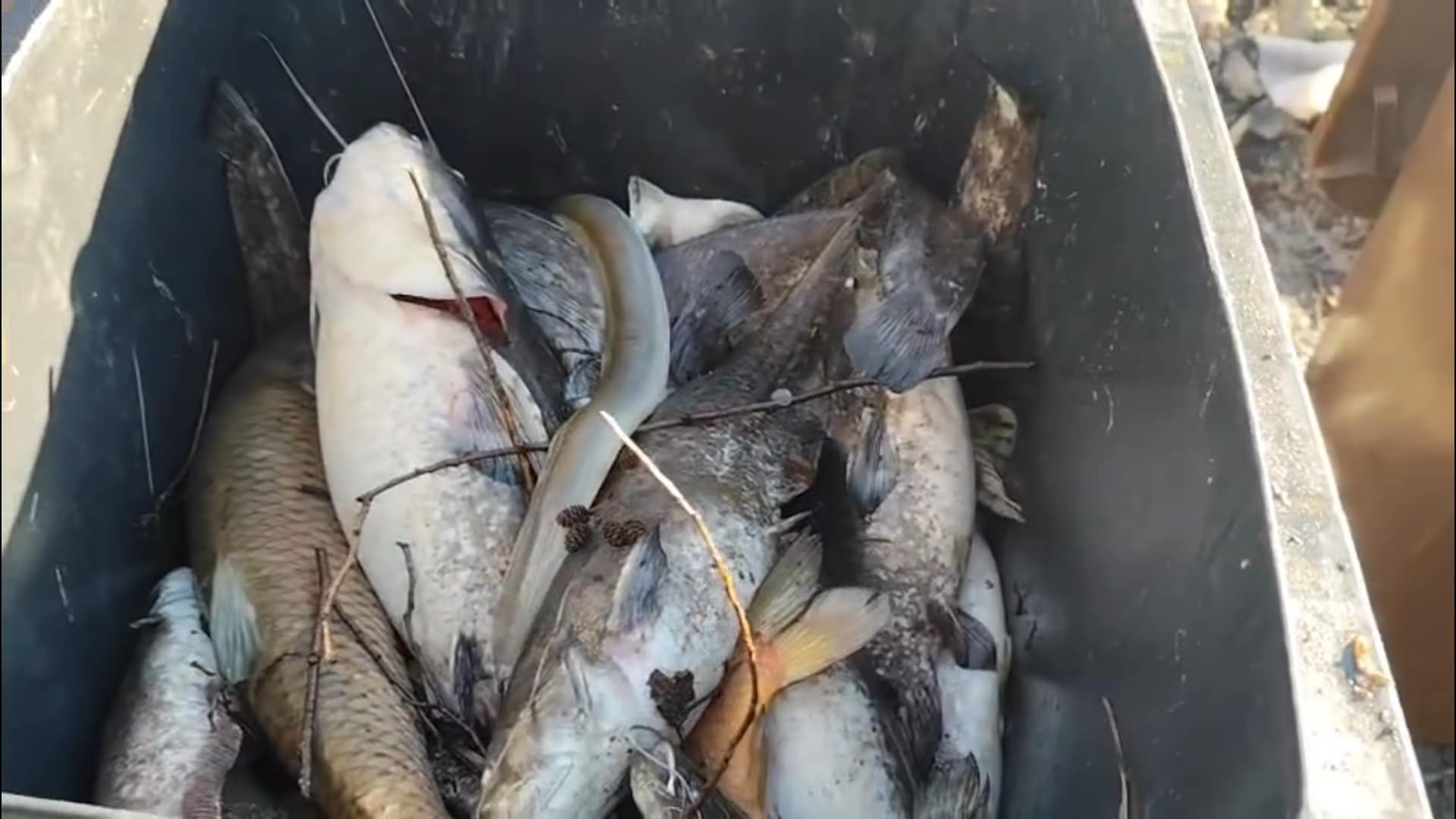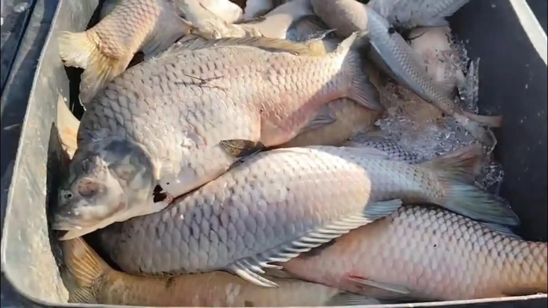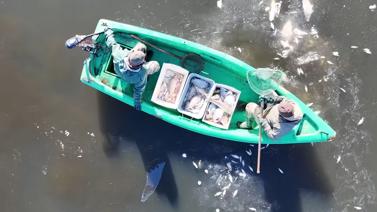 Na záběrech z dronu jsou k vidění rybáři na lodích, kteří sbírají mrtvé ryby z hladiny i z tajícího ledu. Naplní připravené nádoby a přemístí se ke břehu, kde mrtvé ryby přehazují do větších plastových nádob.
