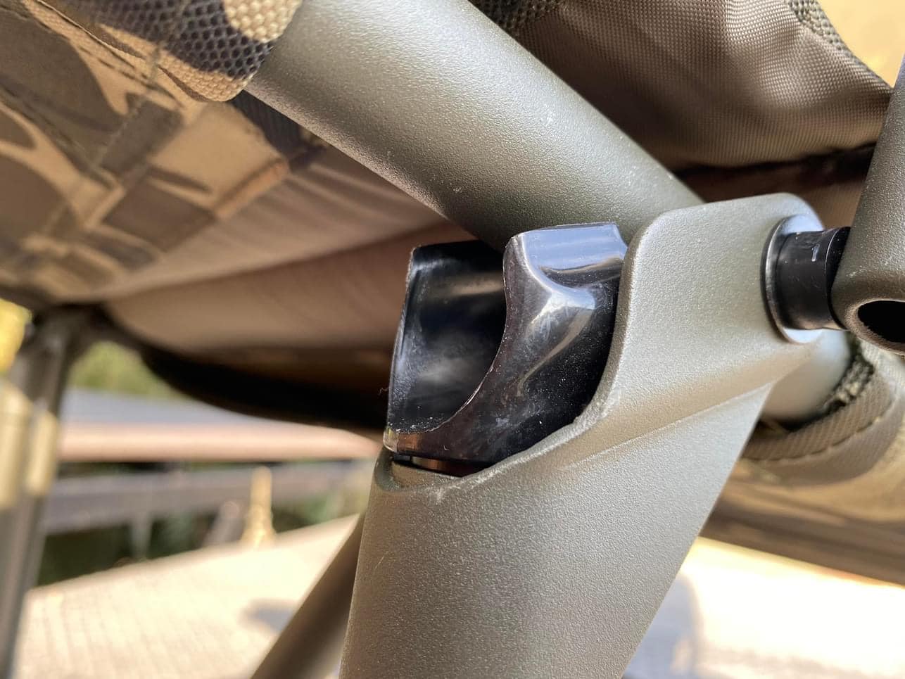 Na samotný závěr jsme si nechali to nejlepší – polohování. Každý z nás si například v autě rád nastaví co nejpříjemnější polohu pomocí kruhového kloubu na straně. A křeslo disponuje naprosto stejným systémem. Otočíte a je to. Můžete sedět ve vzpřímené poloze a kochat se stoupající mlhou nad hladinou nebo si opěrku sklopit tak, že si budete vychutnávat sluneční paprsky. Je to na vás.